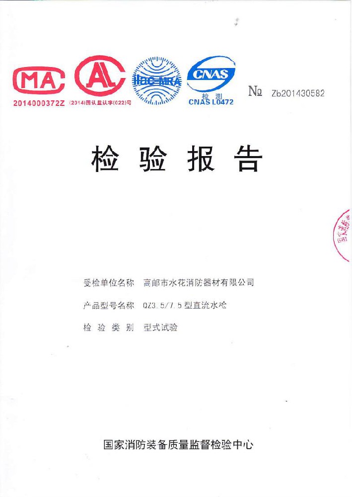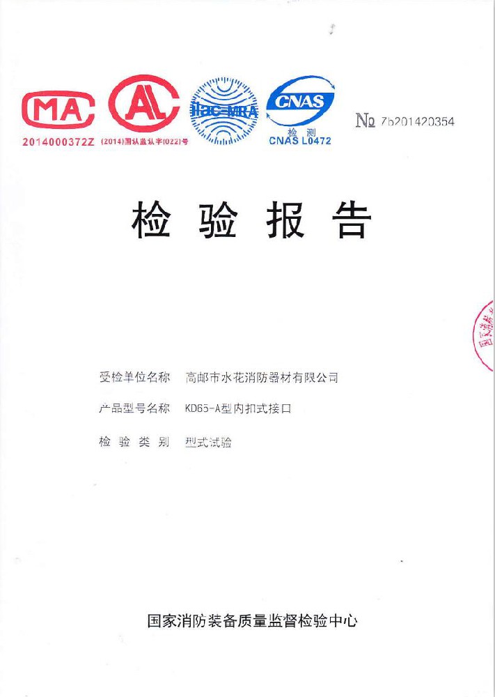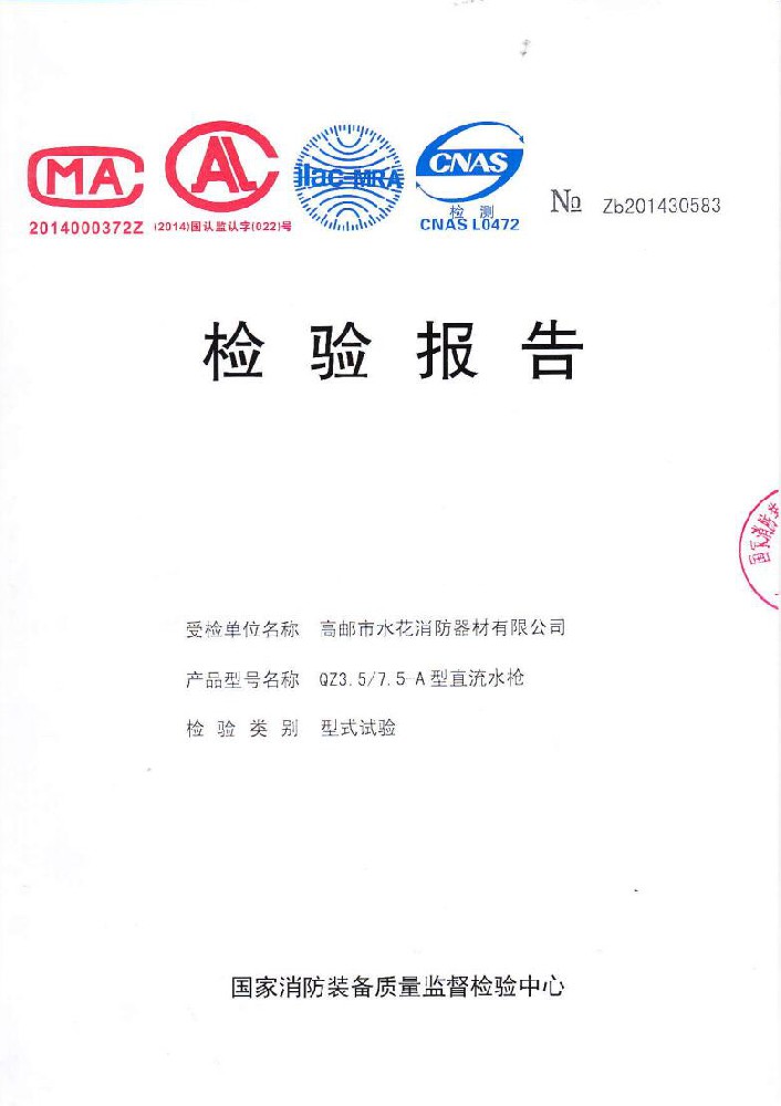 我廠創辦于一九七六年六月,現有職工600人,其中各類技術和管理人員68人。擁有固定資產5000萬元,占地面積35000多平方米,建筑面積25000多平方米。建立了完善的質量體系,取得多種“計量合格確認證書”,并成為江蘇及多省的消防協會會員單位。工廠技術力量雄厚,生產和檢測設備齊全,工藝先進。生產“水花”牌水帶接口: KDK65, KD65,KY65,KN65。消防水槍: QZG3.5/7.5, QZ3.5/7.5,QP8/0.7Z泡沫水槍。室內消火栓: SN65, SNW65-I,SNZ65, SNZW65-I。 消防軟管卷盤JPS0.8-19/25。生產的“郵花”牌,消防有襯里水帶:65-8、10、 13、 16、20、 25型; 80-16、 20、25型。水帶接口: KD50、65; KY50、65;KN65。消防水槍: Q2Z3.5/7.5、 5。 室內消火栓: SN65, SNW65-I, SNZ65, SNZW65-I。 并于二零一五年五月通過公安部消防產品合格評定中心3C換版檢驗,獲得以上產品所有的強制認證證書,準予生產和銷售,產品行銷全國各地,深受廣大用戶好評。